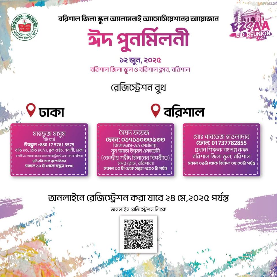 বরিশাল জিলা স্কুল অ্যালামনাই অ্যাসোসিয়েশনের ঈদ পুনর্মিলনী হবে ১২ জুন। এ আয়োজনে অংশ নেবেন স্কুলের সাবেক শিক্ষার্থীরা।