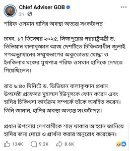 বার্তায় বলা হয়, বুধবার (১৭ ডিসেম্বর) রাত ৯টা ৪০ মিনিটে ড. ভিভিয়ান বালাকৃষ্ণান প্রধান উপদেষ্টা প্রফেসর মুহাম্মদ ইউনূসকে ফোন করেন এবং হাদির চিকিৎসা কার্যক্রম সম্পর্কে অবহিত করেন। তিনি জানান, হাদির অবস্থা অত্যন্ত সংকটাপন্ন।