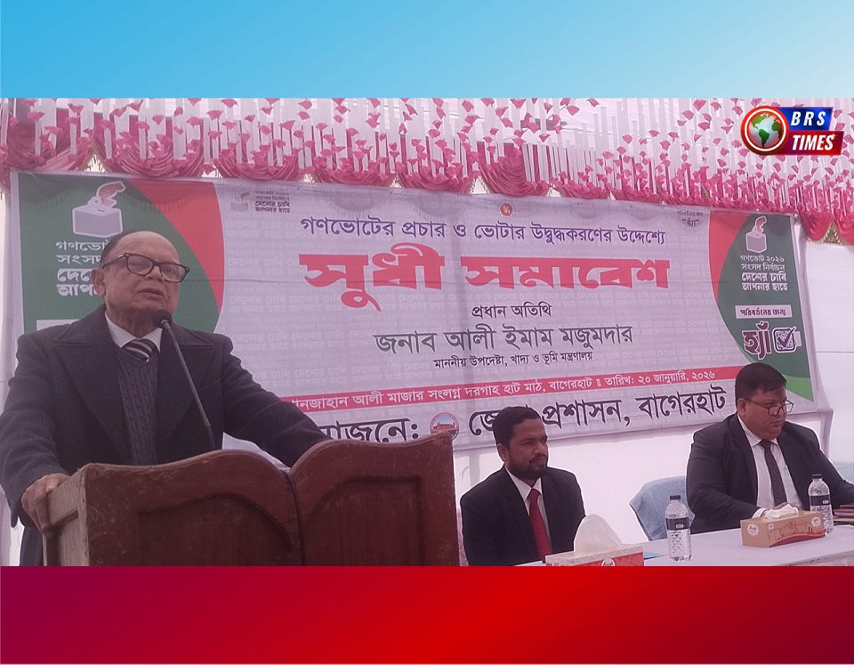 বাগেরহাট প্রতিনিধি : গণভোটের প্রচার ও ভোটারদের সচেতন ও উদ্বুদ্ধ করার লক্ষ্যে বাগেরহাটে সুধী সমাবেশ অনুষ্ঠিত হয়েছে। মঙ্গলবার (২০ জানুয়ারি) দুপুরে খানজাহান আলী মাজার মাঠে জেলা প্রশাসন বাগেরহাটের আয়োজনে অনুষ্ঠিত সমাবেশে প্রধান অতিথি হিসেবে উপস্থিত ছিলেন, খাদ্য ও ভুমি মন্ত্রলালয়ের উপদেষ্টা আলী ইমাম মজুমদার।